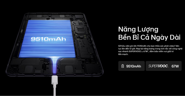 - Máy tính bảng này được trang bị viên pin dung lượng lớn, kết hợp với SuperVOOC 67W, mang đến trải nghiệm sử dụng liền mạch và không gián đoạn.