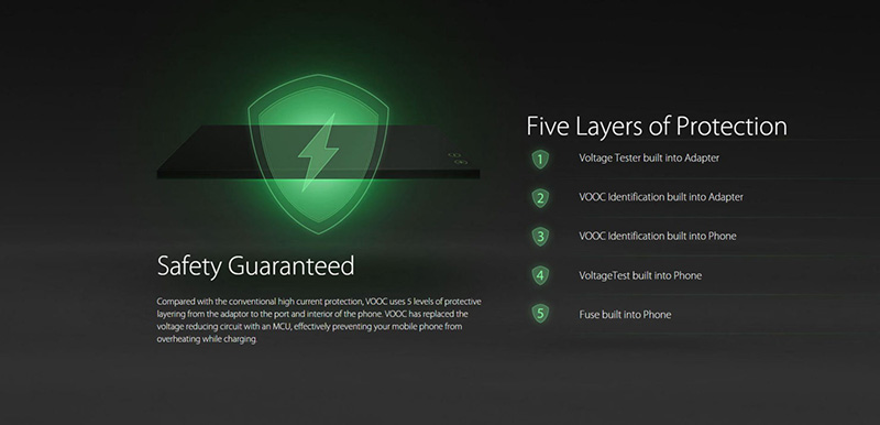 Tại thời điểm đó, OPPO tuyên bố rằng mức điện áp 5V sẽ mang lại lợi ích cho điện thoại vì điện áp thấp sẽ cung cấp nhiệt độ thấp hơn và an toàn nếu sử dụng điện thoại khi đang sạc. Với Super VOOC trên Find X, có khả năng công ty đã kết hợp một số biện pháp bảo vệ để bảo vệ pin và giảm nhiệt độ nhằm ngăn chặn những sự cố xảy ra khi sạc.
